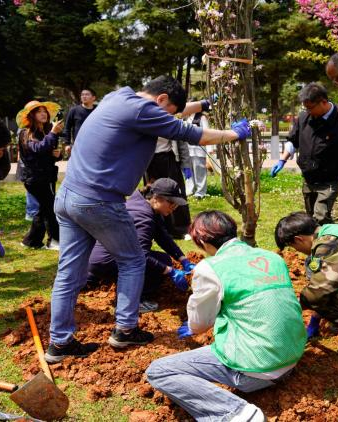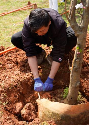 校领导与志愿者携手植树