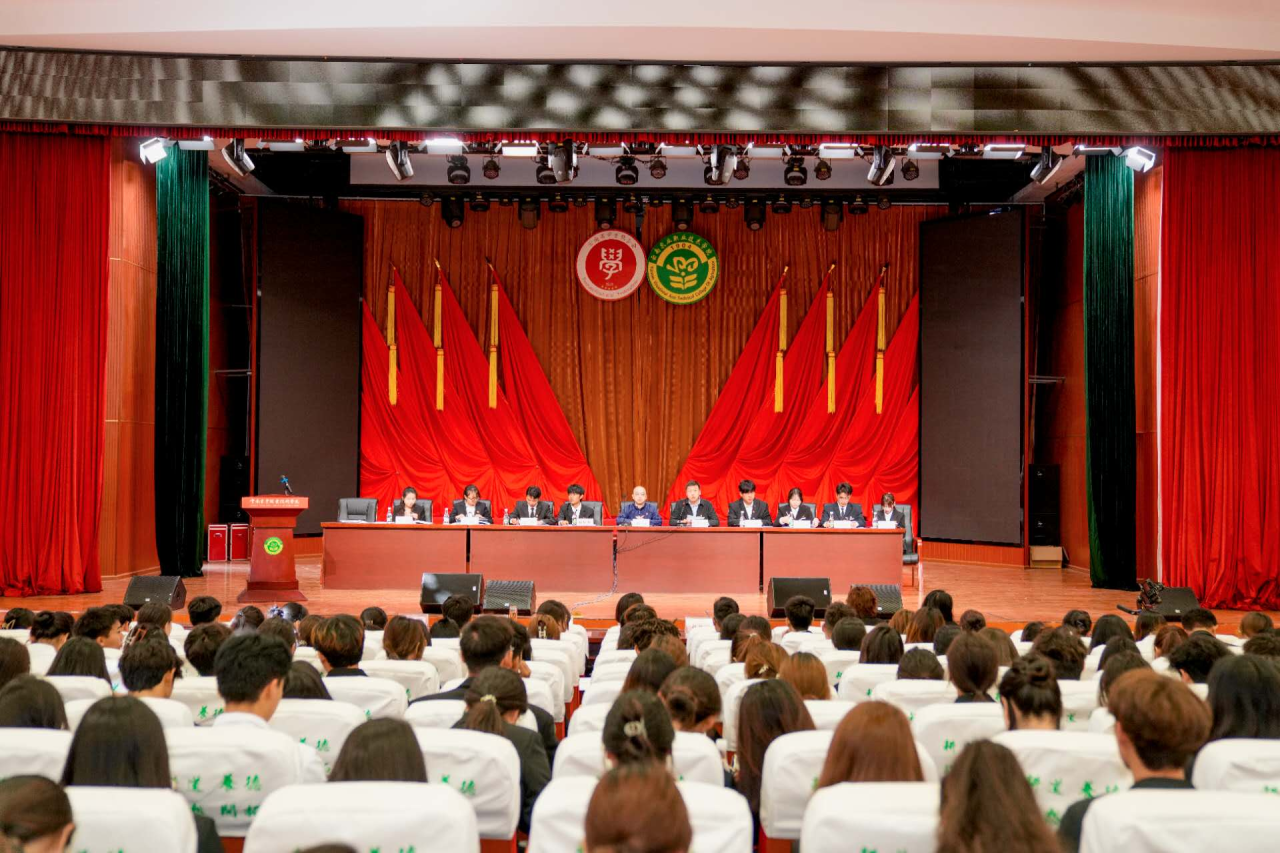 校学生会主席朱颖同学代表第十届学生会委员会作工作报告,系统梳理在思想引领(如“青年大学习”常态化推进)、权益维护(建立“一站式”诉求响应机制)、活动创新(农耕文化节、技能比武大赛等)方面的成果,对标新时代要求直面不足,提出“党建带团建”的改进方向。