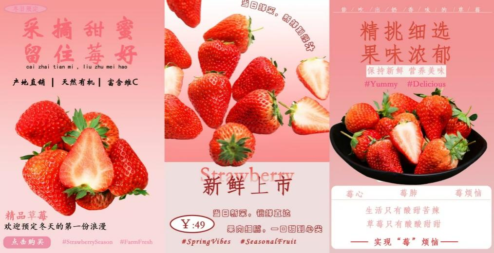 比赛围绕草莓、胸针、蛋黄酥、数码相机等产品开展宣传图创作,选手们运用比赛PS、醒图等工具自主设计,突出产品卖点与小红书平台特色,共收到参赛作品116份。优秀作品构图新颖、色彩协调、电商实用性强,充分展现学子扎实的设计功底与创意能力。